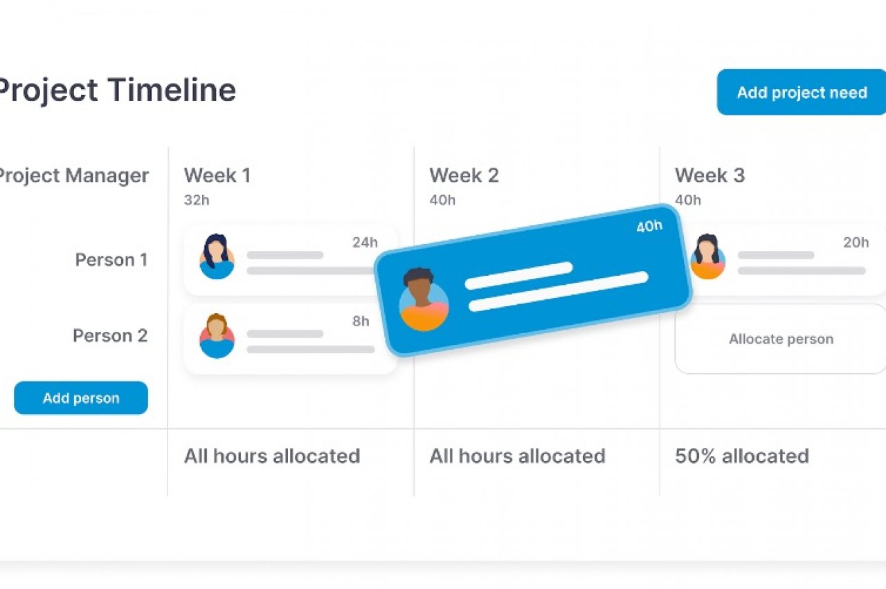 Med vår nya projektplaneringsfunktion kan du smidigt lägga till resursbehov på veckovis eller månadsvis basis och specificera antalet timmar eller heltidsekvivalenter (FTE) som krävs för olika roller. Du kan sedan fördela timmar eller FTE till en eller flera individer.