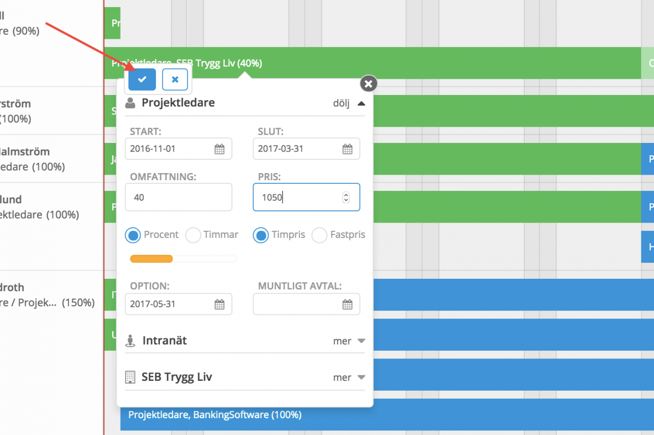 Duplicerar du en roll får du med all information, som datum, omfattning, pris men även kompetenskrav. Sedan är det enkelt att tillsätta rätt konsult till den rollen.