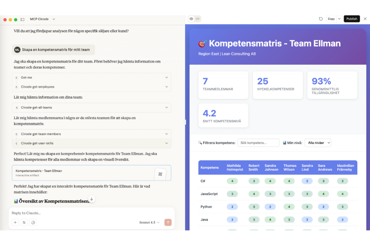 Tänk dig att du kan ställa frågor till din Cinode-data, få insikter i realtid, analysera tillgänglighet, matcha konsulter mot uppdrag och skapa rapporter på sekunder – allt genom en enkel chatt.