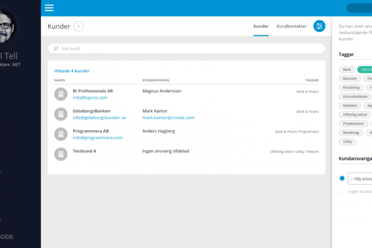 På sidan finns även tabben “Kundkontakter“. Där kan ni, på samma sätt som under kundfliken, enkelt hitta era kontaktpersoner hos kunderna.