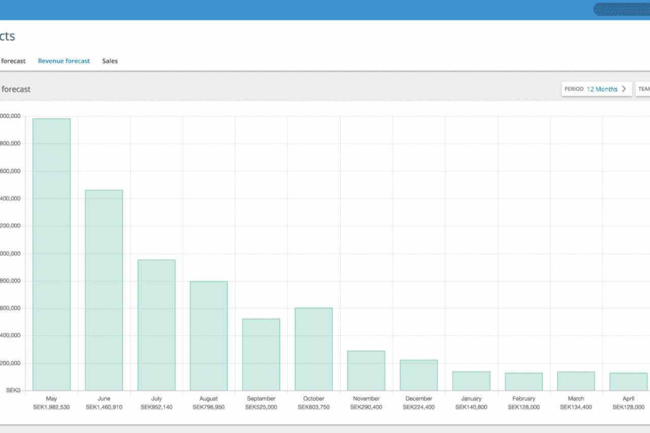 För att få tydligare synlighet över framtida intäkter erbjuder vi nu en ny rapport i Talent Business; Rapporten om intäktsprognos. För att hantera rapporten behöver du åtkomst till funktionen Rapport -> Projekt genom att ha rättigheten CompanyManager. I stapeldiagramet visualiseras ditt företags bokade intäkter under en period på sex eller tolv månader. Staplarna indikerar intäkter per månad och baseras på den angivna tidsperioden, omfattningen och priset för tilldelade roller minskat med den planerade frånvaron för den tilldelade konsulten.