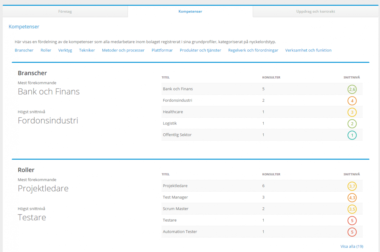 Vägledning för självskattning och en enkelhet att sätta sina nivåer är viktigt för att få en kontinuerlig uppdatering av era kompetenser. I takt med att era konsulter fördjupar och breddar sina kompetenser ska denna information i realtid slå igenom i er kompetensinventering. Er totala kompetens och styrka som attraktiv leverantör av kvalificerade konsulttjänster blir då summan av era medarbetare.