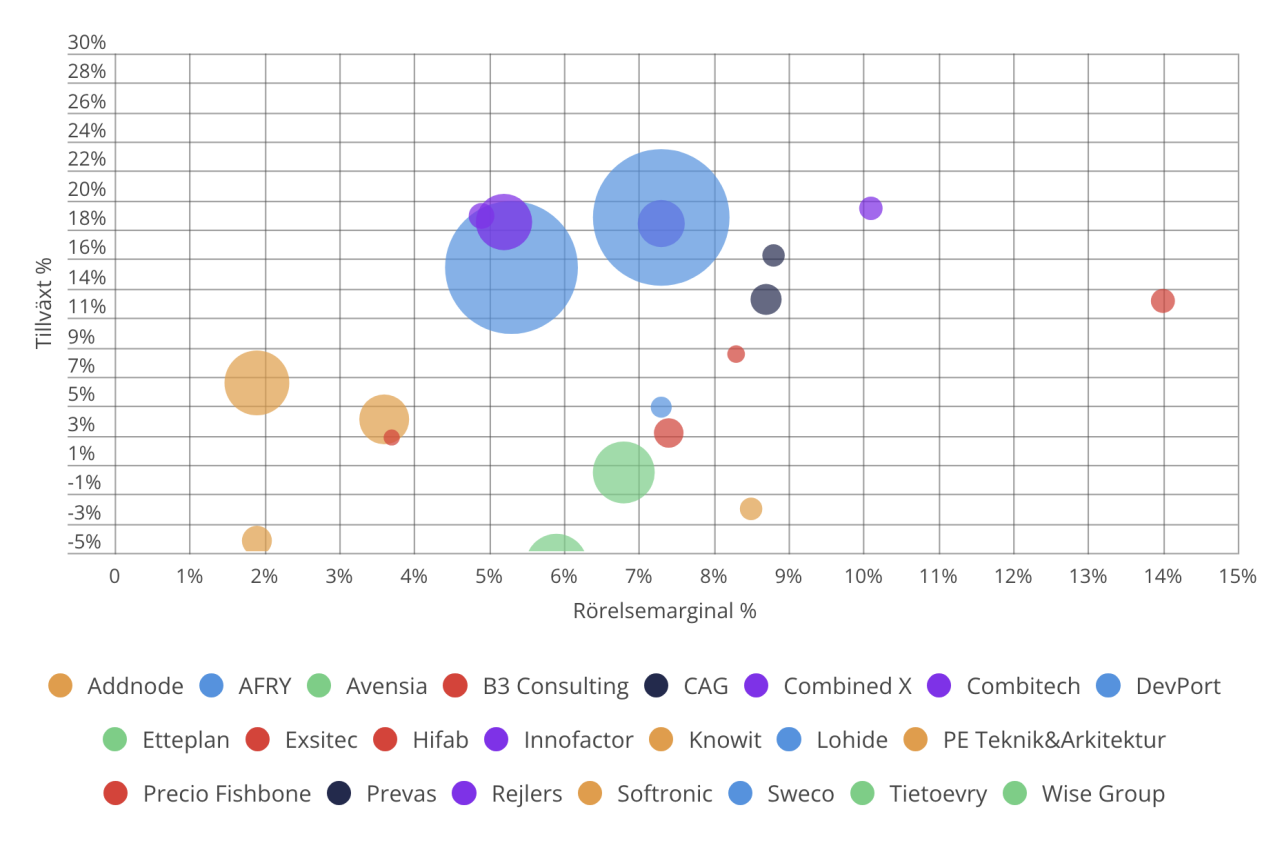 Tillväxten har tvärbromsat och låg under kvartalet på i snitt 7,5 procent, det vill säga lägre än inflationen. För ett kvartal sedan låg den på över 15 procent. En annan orsak till att tillväxten har bromsat in är att vi har sett betydligt färre förvärv den senaste tiden vilket också är ett tecken på avmattning på marknaden. Mest växte Combined X, Innofactor samt Sweco.