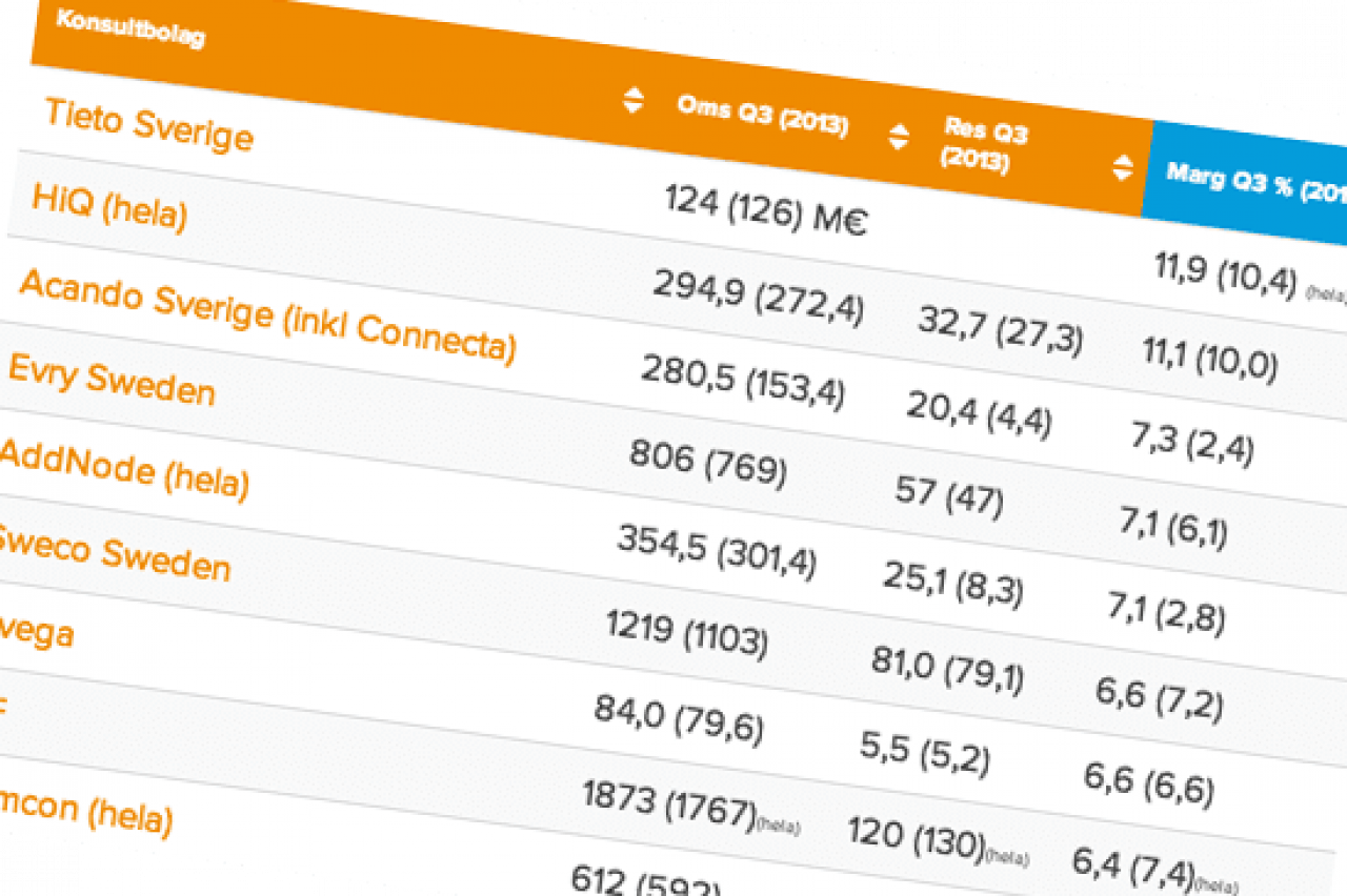 | Konsultbolag | Oms Q3 (2013) | Res Q3 (2013) | Marg Q3 % (2013) |