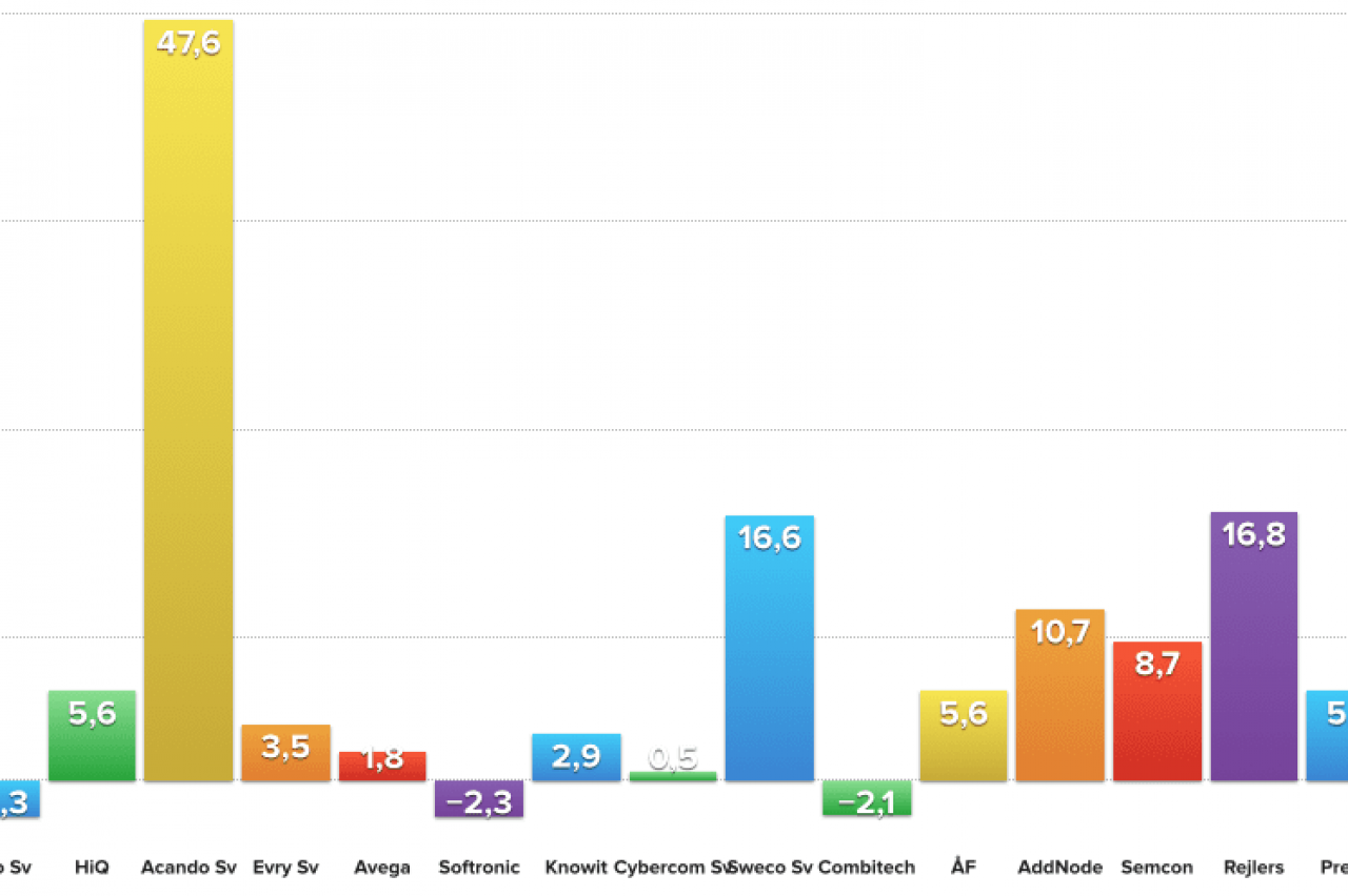 Acando Sverige, med Connecta-förvärvet, är givetvis det bolag som har ökat omsättningen mest under året. Men även Sweco, Rejlers och Addnode har växt tvåsiffrigt.
