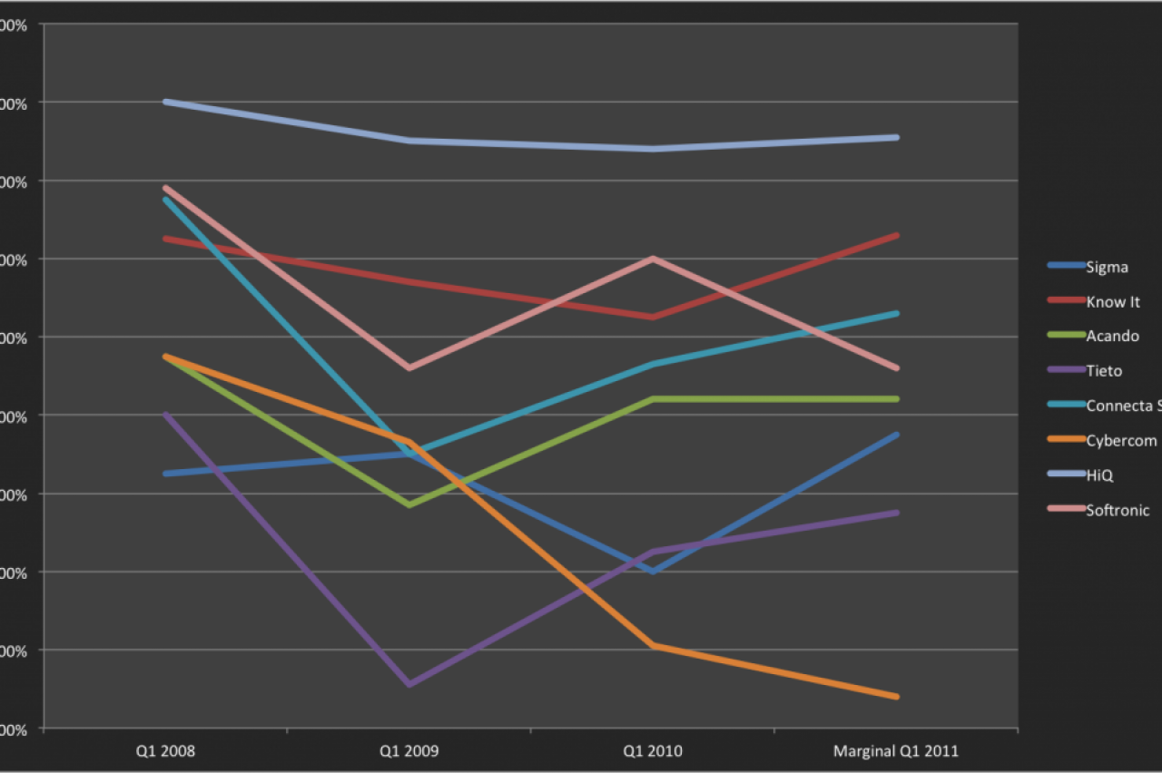 Nedan diagram över teknik- konsultbolagens rörelsemarginal Q1 2008 fram till Q1 2011.