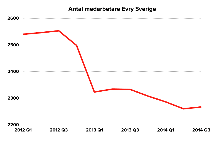 Evry Sverige har haft en relativt tuff resa under de senaste kvartalen. Omsättningen och rörelsemarginalen har legat på ungefär samma nivåer men antalet medarbetare har sjunkit med nästan 300 personer sedan Q1 2012.
