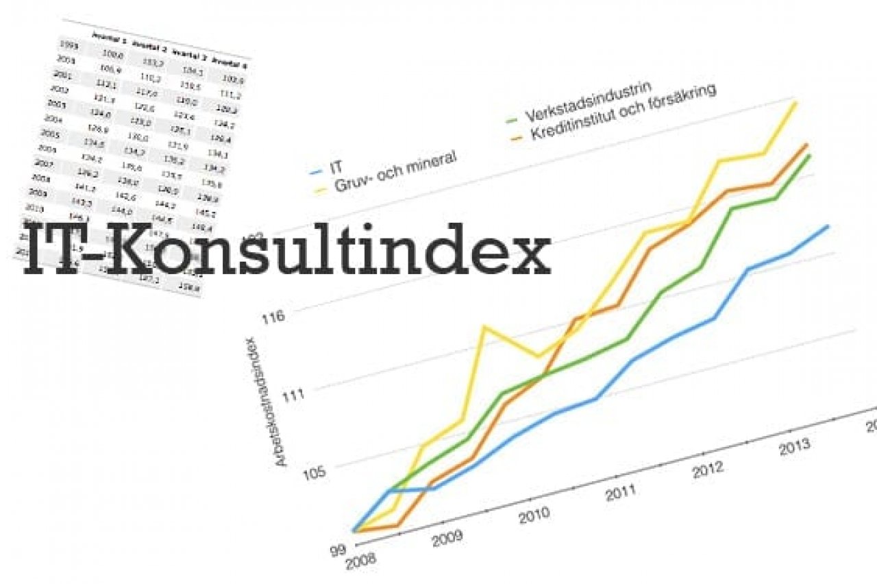 Varje kvartal beräknar SCB ett indextal för arbetskostnadernas utveckling för IT-konsultbranschen, vilket benämns IT-konsultindex.