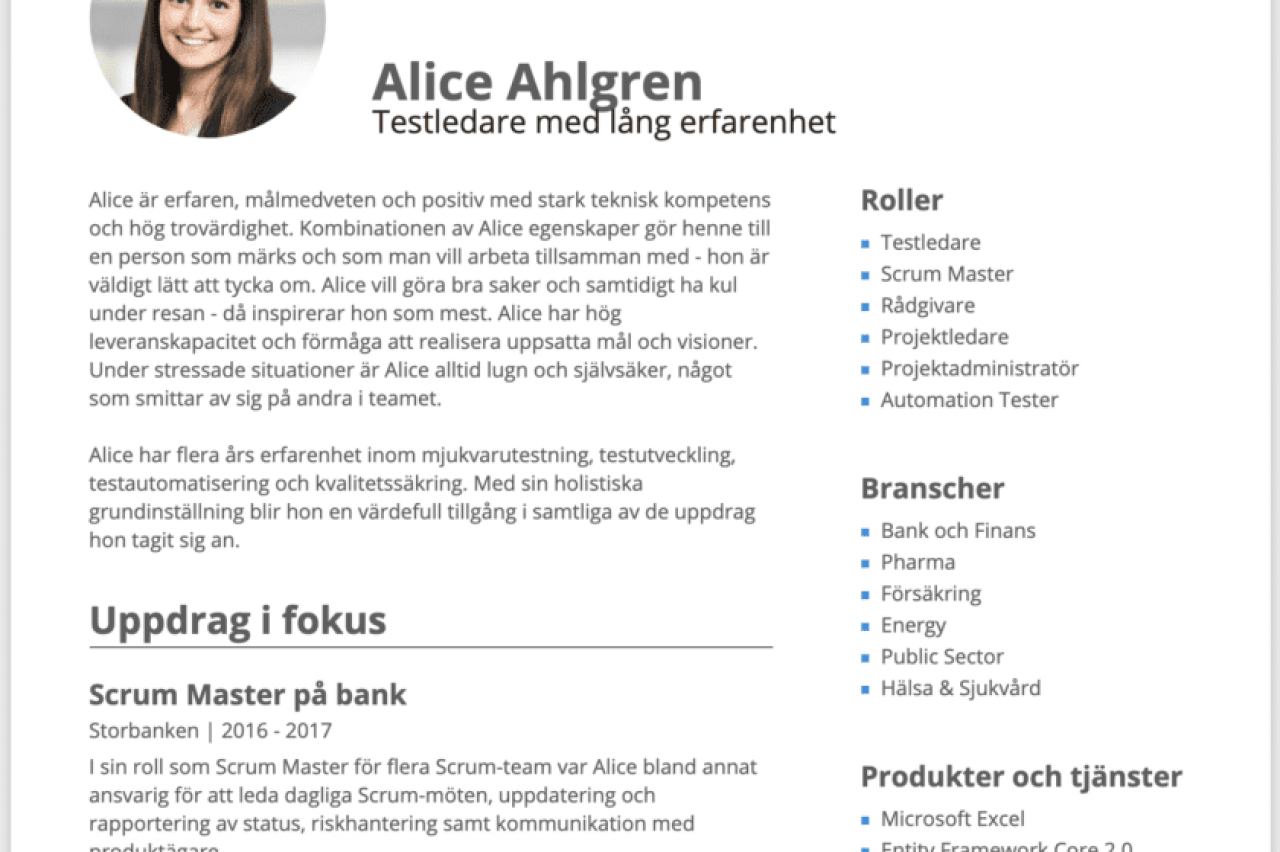 Är du redan erfaren och kommit långt i karriären har du i regel en mängd uppdrag bakom dig. Var noggrann när du väljer vilket eller vilka uppdrag du tar med på förstasidan. Presentera de mest relevanta baserat på bransch, metoder, roller och kompetenser och glöm inte att vara tydlig med ditt ansvar, ditt resultat och det värde du skapade åt din uppdragsgivare. Visa konkreta case du gjort som styrker erfarenheten. Antag att du varit projektledare för ett visst projekt och kund under nio månader. I vilket sammanhang verkade du i projektet, med vilket ansvar och vilket resultat uppnåddes tack vare din insats?