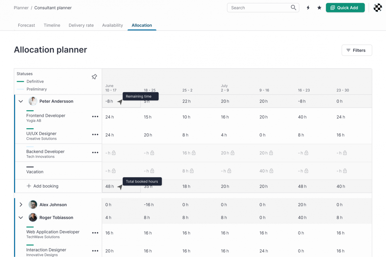 When consultants move between engagements week by week and hours vary continuously, it’s not enough to know that “Anna works on Project X”. You need to know how many hours, which week, and what that means for every other project she’s involved in.