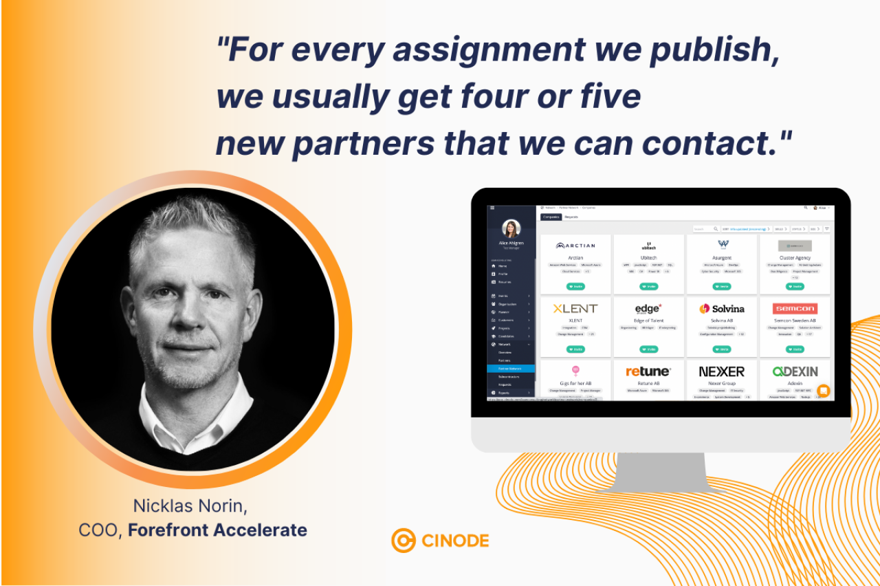 Forefront Accelerate, with around 150 consultants currently on assignments, switched from Excel to Cinode to manage its partner network and reach them with relevant assignment requests, as well as to keep track of their combined expertise.