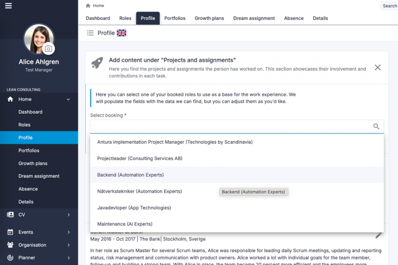 Once the consultant is booked, you can now import the assignment into the CV and improve the text with a single click.