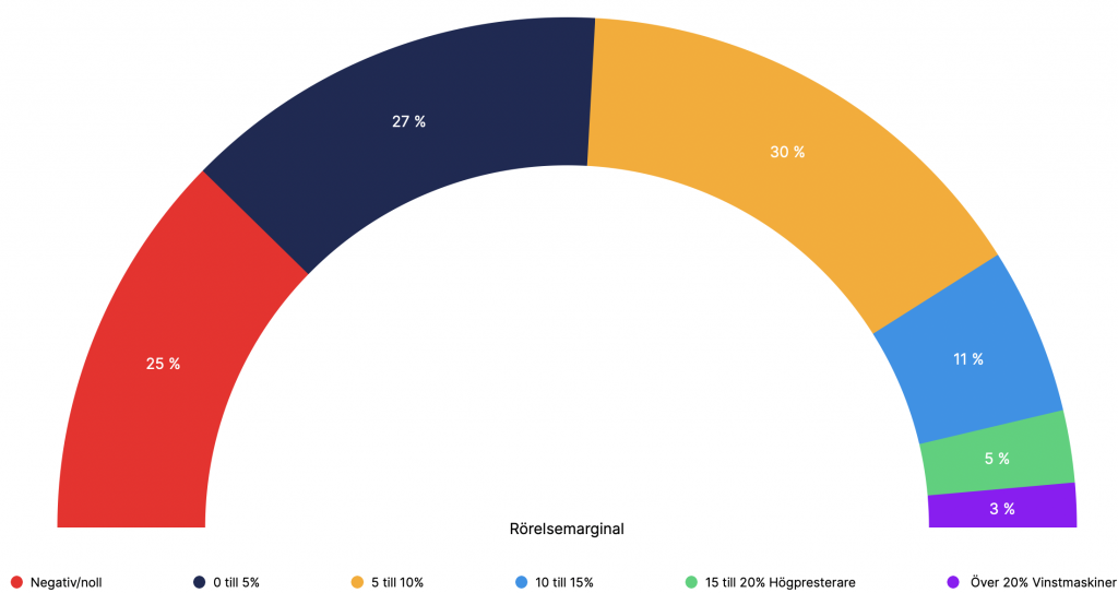 Ser vi till hur rörelsemarginalen har förändrats under året, har hälften av bolagen en lägre marginaler. Ungefär en fjärdedel har lyckats förbättra sina marginaler, medan resterande fjärdedel ligger kvar på en i stort sett oförändrad nivå.