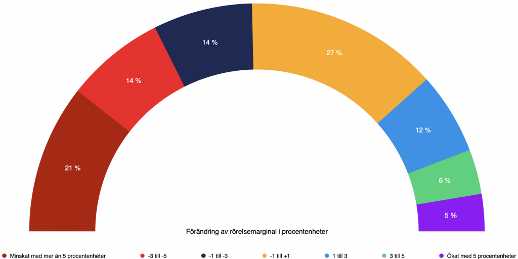 Ser vi till hur rörelsemarginalen har förändrats under året, har hälften av bolagen en lägre marginaler. Ungefär en fjärdedel har lyckats förbättra sina marginaler, medan resterande fjärdedel ligger kvar på en i stort sett oförändrad nivå.