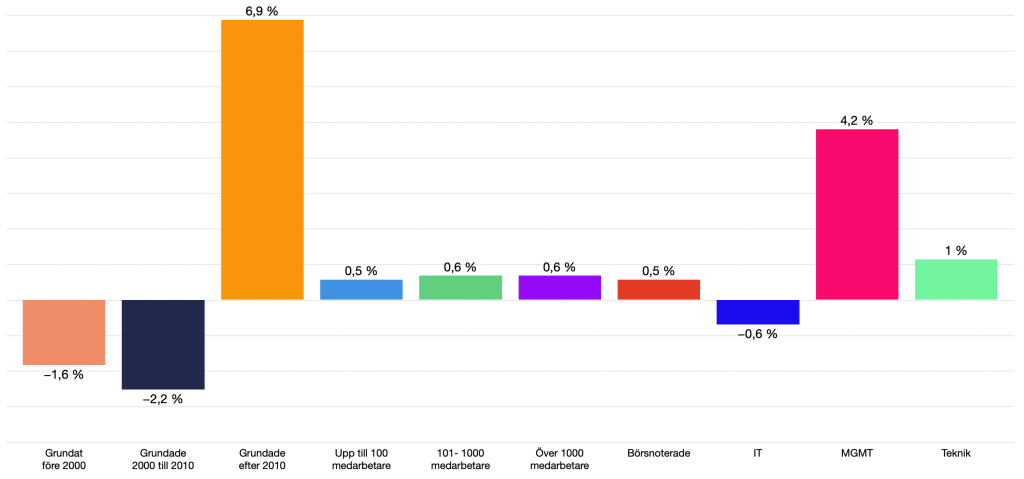 Det är framför allt de yngre bolagen – grundade efter 2010 – som fortsatt visar tillväxt. Deras framgång drivs ofta av nischade erbjudanden, hög specialiseringsgrad och en stark förmåga att snabbt anpassa sig till marknadsförändringar. Samtidigt ger detta en något skev bild, då det är just bland de yngre bolagen som flest konkurser sker – företag som inte ingår i analysen. Äldre bolag tenderar däremot att stå stilla eller backa i tillväxt. Även större aktörer påverkas negativt – med lägre tillväxttakt och förlängda säljcykler.