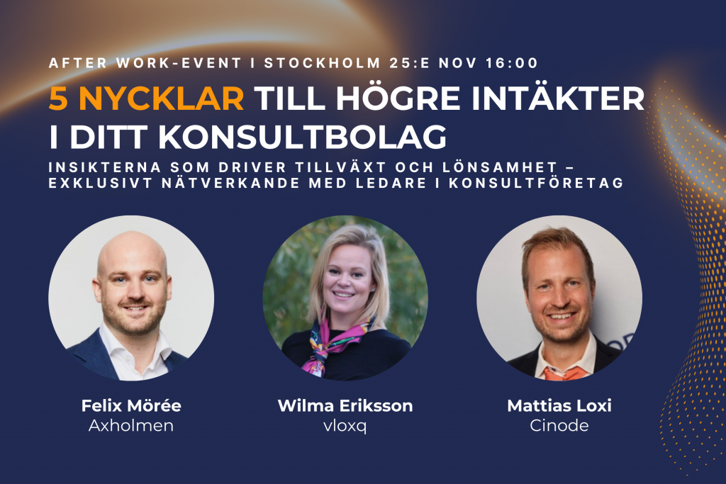 25:e november November bjuder vi in dig som är ledare i konsultföretag till ett exklusivt after work-event i Stockholm. Pris- och tillväxtexperten Felix Mörée (Axholmen), delar tillsammans med mig och Wilma Eriksson (vloxq) med sig av de 5 nycklarna som ökar intäkterna och skapar lönsamma konsultföretag.